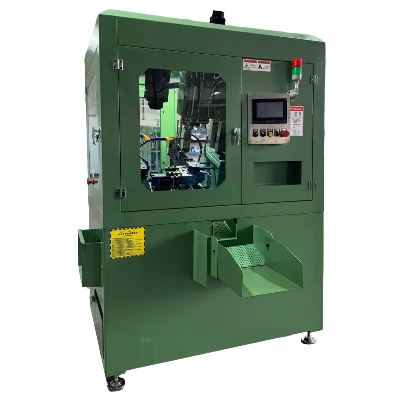 2. The machine is fully automated, utilizing a vibration feeder for material supply, automatic clamping and tapping, and automatic material removal. One person can monitor multiple such machines.